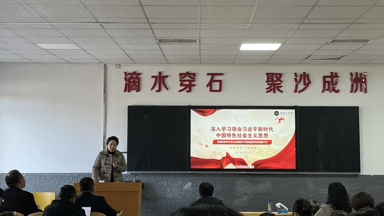 12月6日,党委书记胡晓梅到经济与管理学院,围绕深入贯彻习近平新时代中国特色社会主义思想和党的二十大精神,认真贯彻落实省委十三届六次全会精神,聚焦辽宁全面振兴新突破三年行动和打造新时代“六地”目标要求教书育人,为全院教师讲授题为《在服务新时代东北全面振兴中建设最好的应用型大学》专题党课,与学院领导班子成员吴琼、陈勇、李阳座谈了解学院发展建设情况。