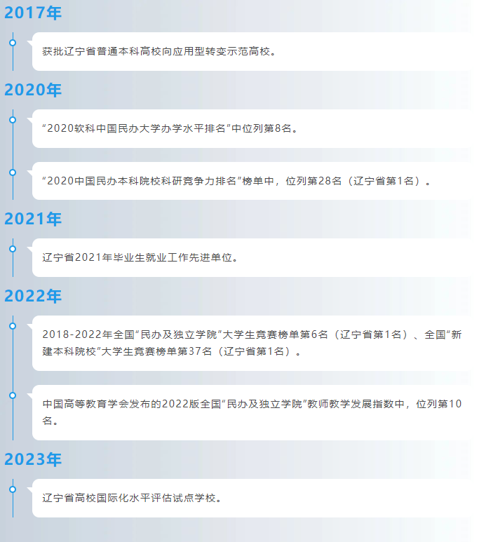 学校构建了“1344”创新创业教育体系。近三年,学生在各级各类学科竞赛中获得国家级奖项620项,省级奖项6953项。在中国高等教育学会发布的高校大学生竞赛排行榜中,我校位列2018-2022年全国普通高校(本科TOP300)第289名,2018-2022年全国“民办本科及独立学院”第6名(辽宁省第1名),2018-2022年全国新建本科院校第37名(辽宁省第1名)。