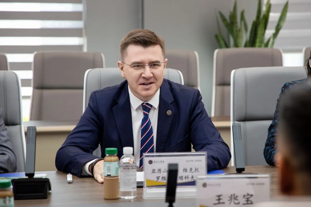 亚历山大·舒恩科夫对我校的热情接待表示衷心感谢,对我校在国际合作、人才培养、实验室建设、科学研究等多方面取得的成绩给予充分肯定,并全面介绍了克麦罗沃国立文化学院联合培养方面及与国内高校合作项目的基本情况。他希望,双方能充分发挥自身优势,携手并进、合力攻坚,不断强化办学特色,实现优势互补,共同推动两校高质量发展。