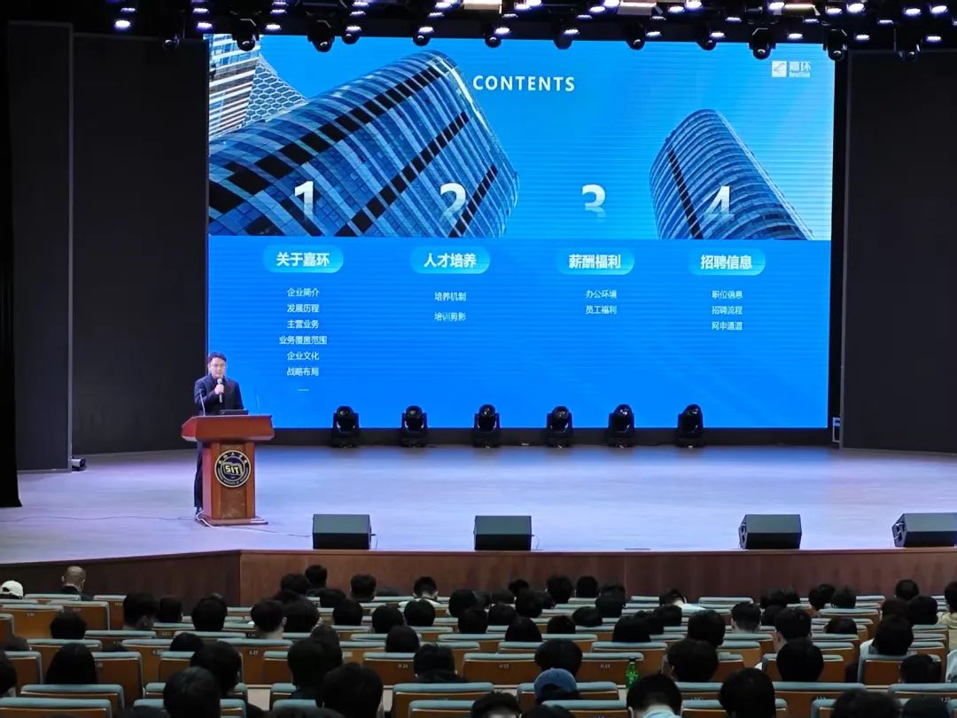 本次双选会活动前还举办了企业宣讲会。嘉环科技股份有限公司、北京外企德科人力资源服务上海有限公司、沈阳中软卓越信息技术有限公司、合肥神州数码有限公司、北京正道缘科技有限公司五家企业还在校图书馆礼堂召开企业宣讲会,800余名学生参加。企业代表们通过详实的案例与生动的讲解,分享了企业发展现状、业务领域、人才需求及职业发展规划等内容,为同学们带来了一场干货满满的职业发展盛宴。