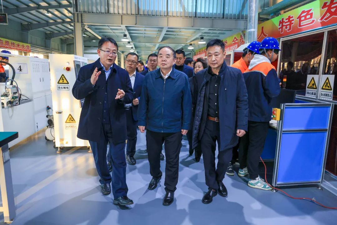 周济院士实地察看了我校先进制造技术中心的智能制造实训基地、工业机器人基地、智能高速五轴实训基地,详细了解学校智能制造应用型人才培养相关情况,观看了智能制造相关专业学生的实训课程。随后,就智能制造应用型人才培养开展座谈。