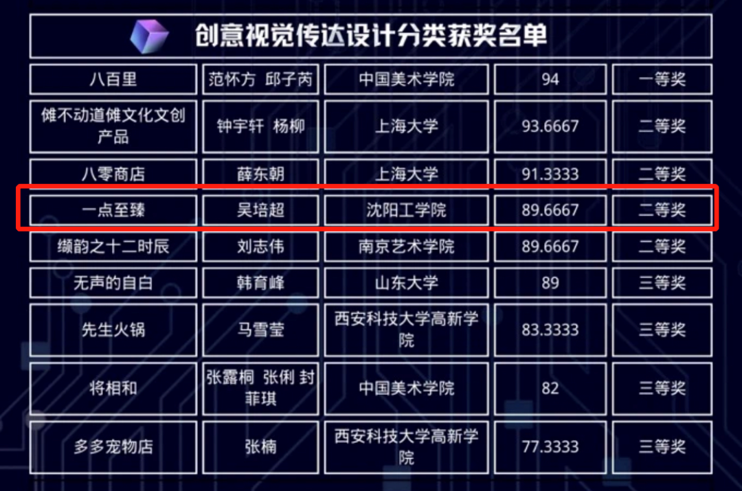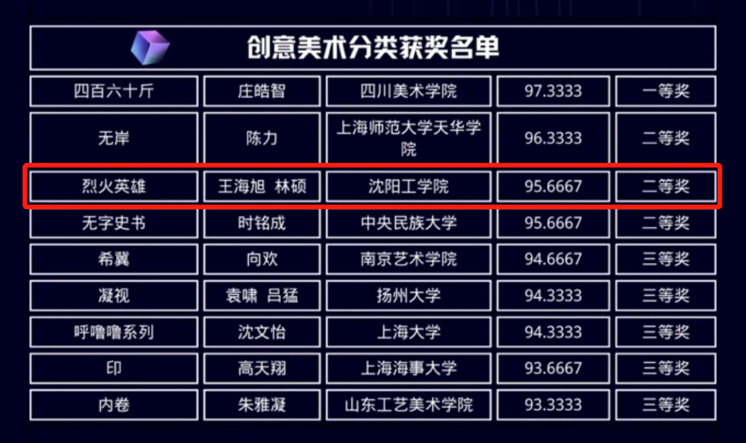 近日,第四届中国大学生创意节全国总决赛落下帷幕,艺术与传媒学院工艺美术专业学生王海旭、林硕的作品《烈火英雄》获创意美术类全国二等奖,视觉传达设计专业学生吴培超的作品《一点至臻》获创意视觉传达设计类全国二等奖。