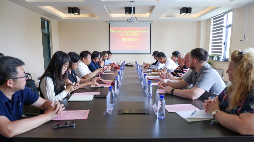 5月30日,沈抚示范区招商四部副部长张斌、产业创新局科长魏超,中科(沈抚)创新园项目负责人董全亮一行应邀访问我校,就专家工作站等事宜与我校和白俄罗斯国立技术大学专家进行座谈交流。校长李康举、副校长徐颖、白俄罗斯国立技术大学专家及相关单位负责人参加座谈。