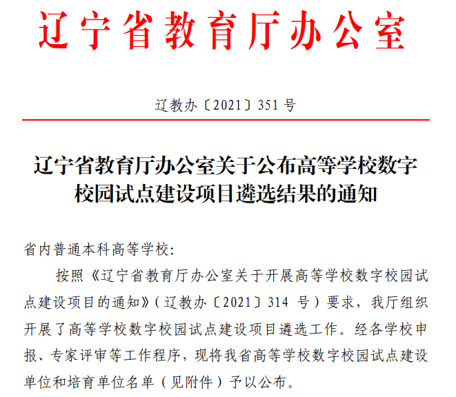近日,辽宁省教育厅办公室发布了《关于公布高等学校数字校园试点建设项目遴选结果的通知》(辽教办〔2021〕351号),九九精品视频一区在线久久久久久久久久毛片精品美女|国产99久久久久久免费看|中文精品99久久国产|国产69精品久久久久9999|精品久久久久久中文字幕无码|亚洲熟妇无码久久精品国产精品99|精品国产天堂综合一区在线获批成为辽宁省高等学校数字校园培育单位。